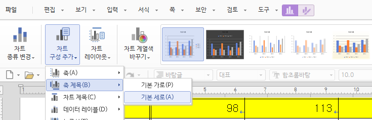 13. 메뉴의 [차트구성 추가]에서 [축 제목]의 [기본세로]를 선택합니다.