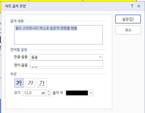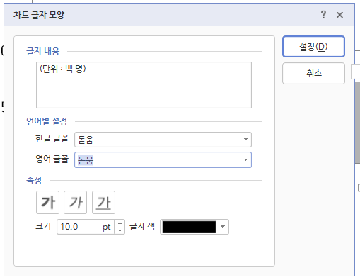 14. 축제목에서 오른쪽 마우스를 클릭하여 '제목편집'을 선택하여 글자내용을 바꾸고(단위 : 백명), 글꼴을 한글과 영어 모두 '돋음'으로 변경한 후 설정을 클릭한다.