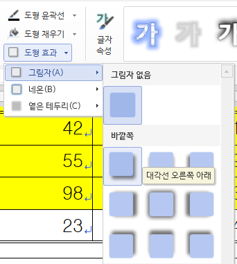 9. 그림자 지정 (대각선 오른쪽 아래)에서 지정합니다.