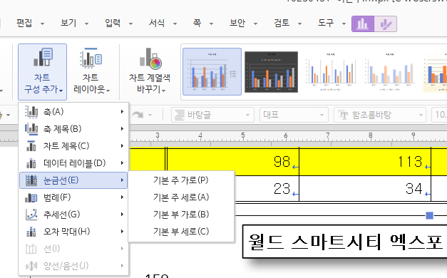 16. 눈금선을 선택하여 [Delete] 키를 누른다. 또는 메뉴에서 눈금선을 체크를 풉니다.