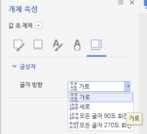 15. 다시 오른쪽 마우스를 클릭하여 개체 속성에서 [크기 및 속성]의 글자 방향을 '가로'로 지정한다.