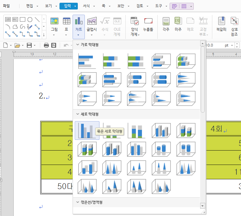2. [입력] - [차트]-묶은 세로 막대형을 선택합니다.