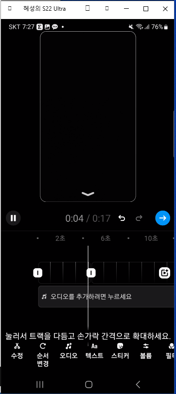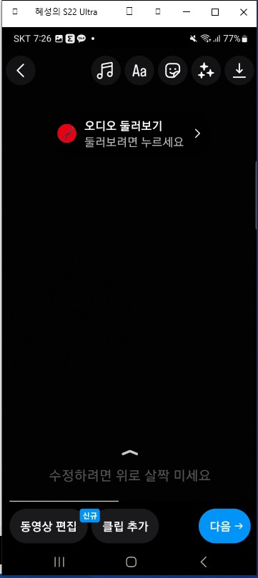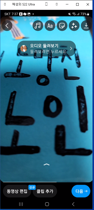 4. [다음]을 클릭하면 내가 찍은 영상이 나타나고 음악, 글자, 효과 등을 넣고 영상을 완성해준다.