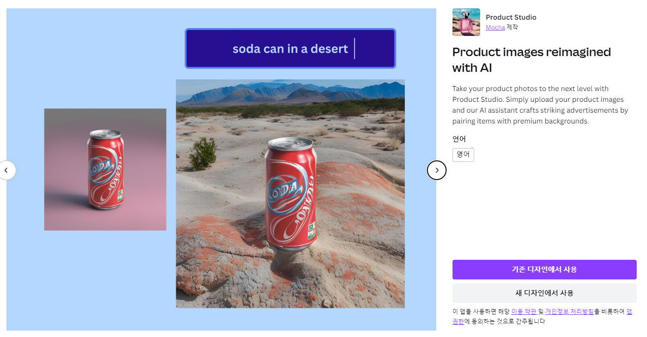 제품 이미지를 업로드하고 배경을 설명하여 제품 사진을 결합하고 생성합니다.