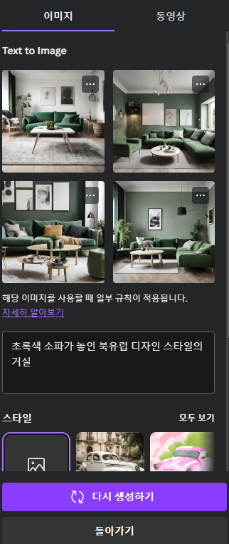 AI를 통해 콘텐츠에 기반한 스타일을 제안받거나 다른 스타일로 선택할 수 있다.