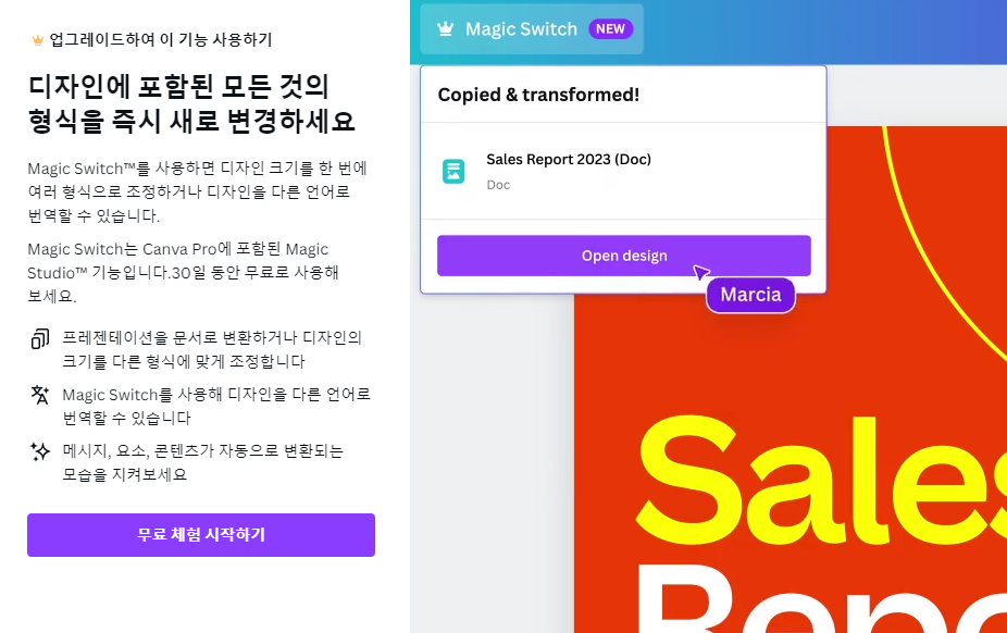 디자인의 크기를 한 번에 여러 형식으로 조정하거나 디자인을 다른 언어로 번역할 수 있습니다.
