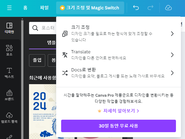 디자인의 크기를 한 번에 여러 형식으로 조정하거나 디자인을 다른 언어로 번역할 수 있습니다.