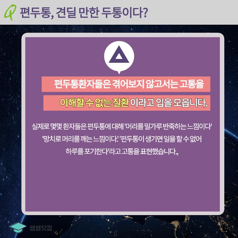 '망치로 머리를 깨는 느낌이다.' '편두통이 생기면 일을 할 수 없어