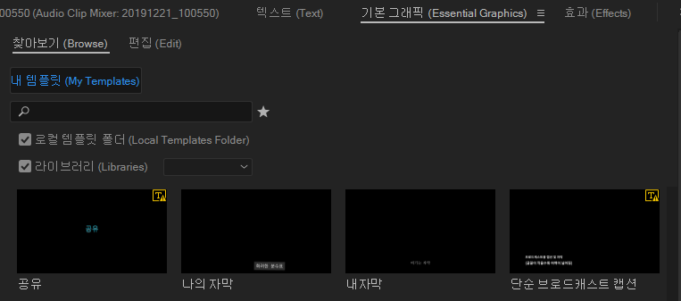 4. [기본그래픽]의 [찾아보기] - 내 가 저장해둔 [내 자막] 스타일을 타임라인의 사진이나 동영상으로 드래그해서 사용한다.