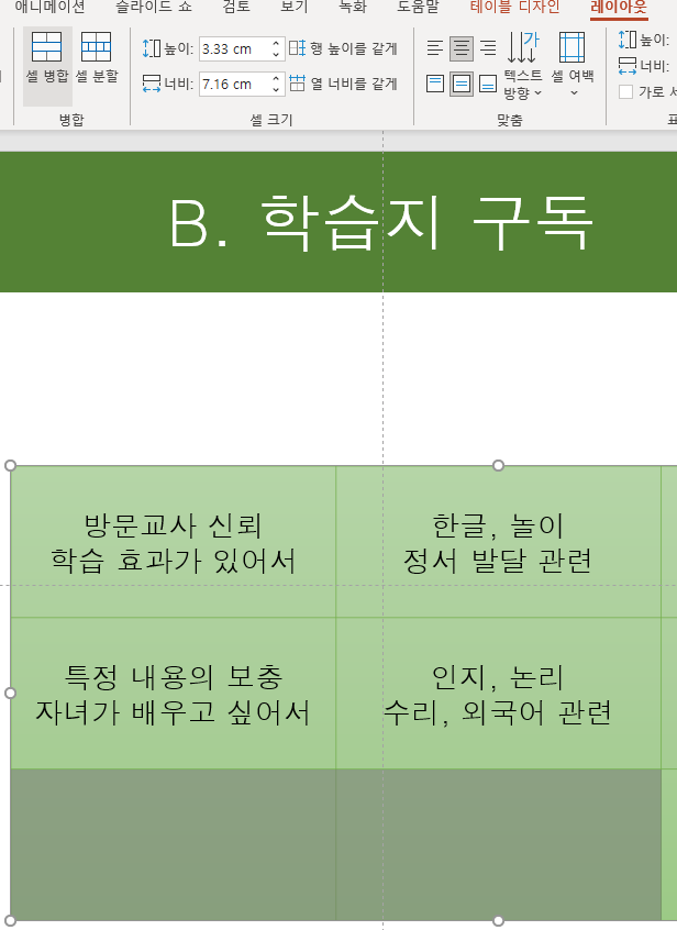 7. 병합할 두개의 셀을 드래그하여 선택한 후 [레이아웃] 탭의 [병합] 그룹에서 [셀 병합]을 클릭합니다.