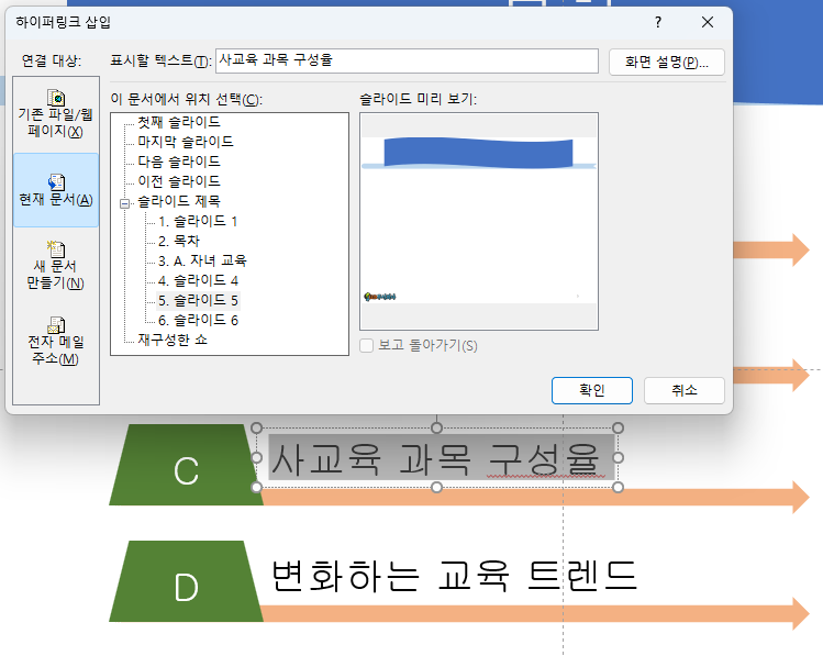 하이퍼링크 삽입 대화상자에서 [연결 대상]을 [현재 문서]의 '슬라이드 5'를 선택하고 [확인]을 클릭한다.