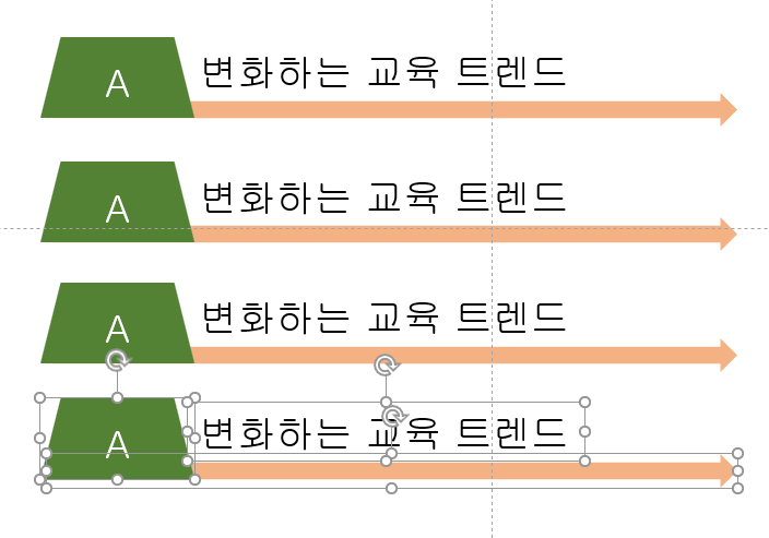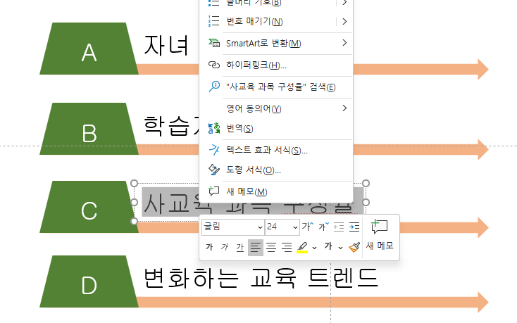 세개의 개체를 드래그하여선택한 후 [세이프 형식]에서 [도형 스타일]에서 [도형 윤관석]의 '윤곽선 없음'을 클릭하고 글꼴을 지정한다.(굴림, 24pt)